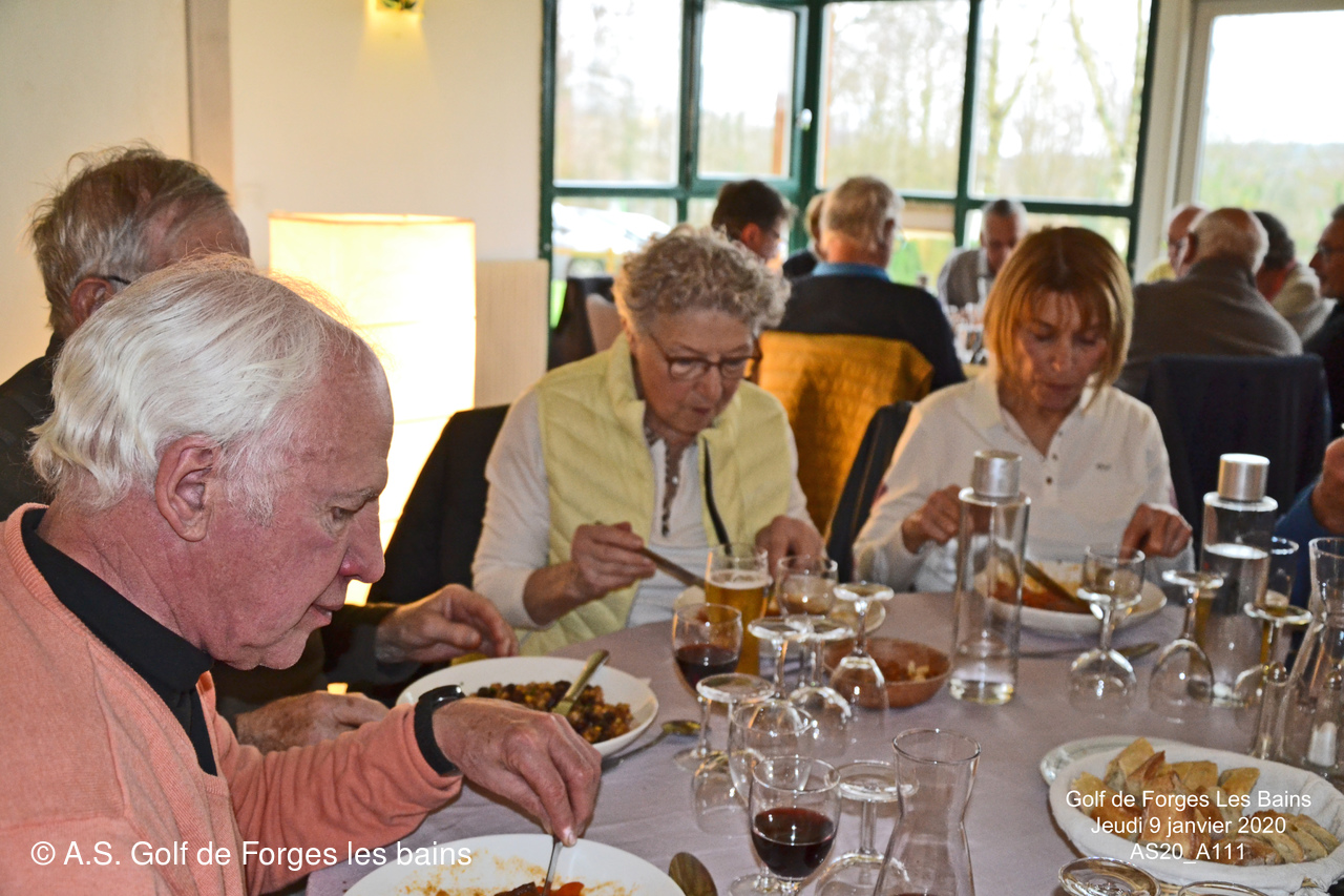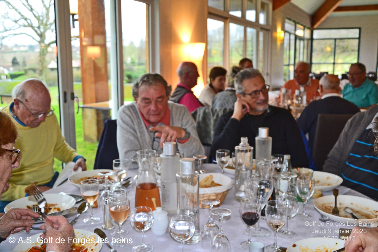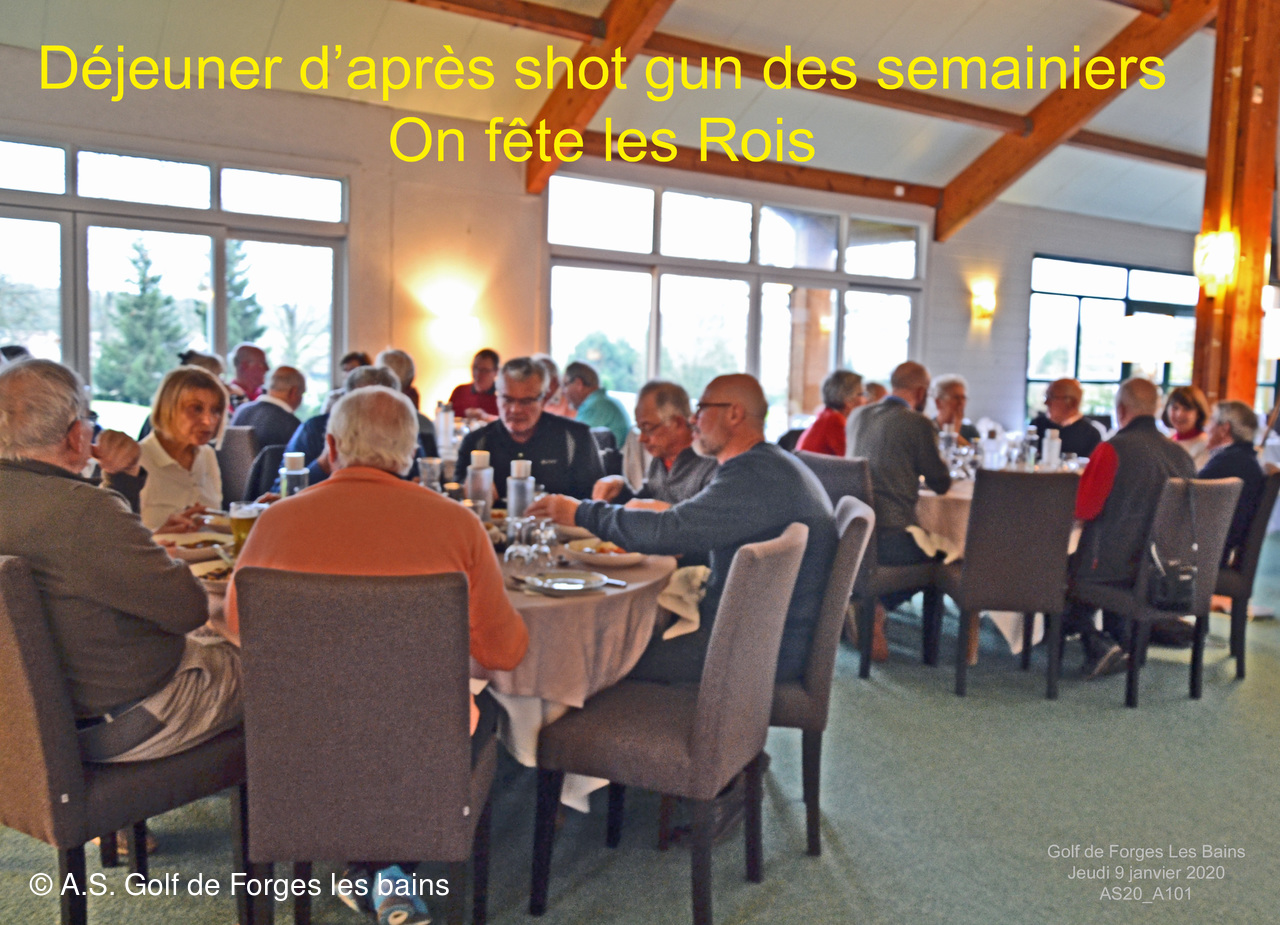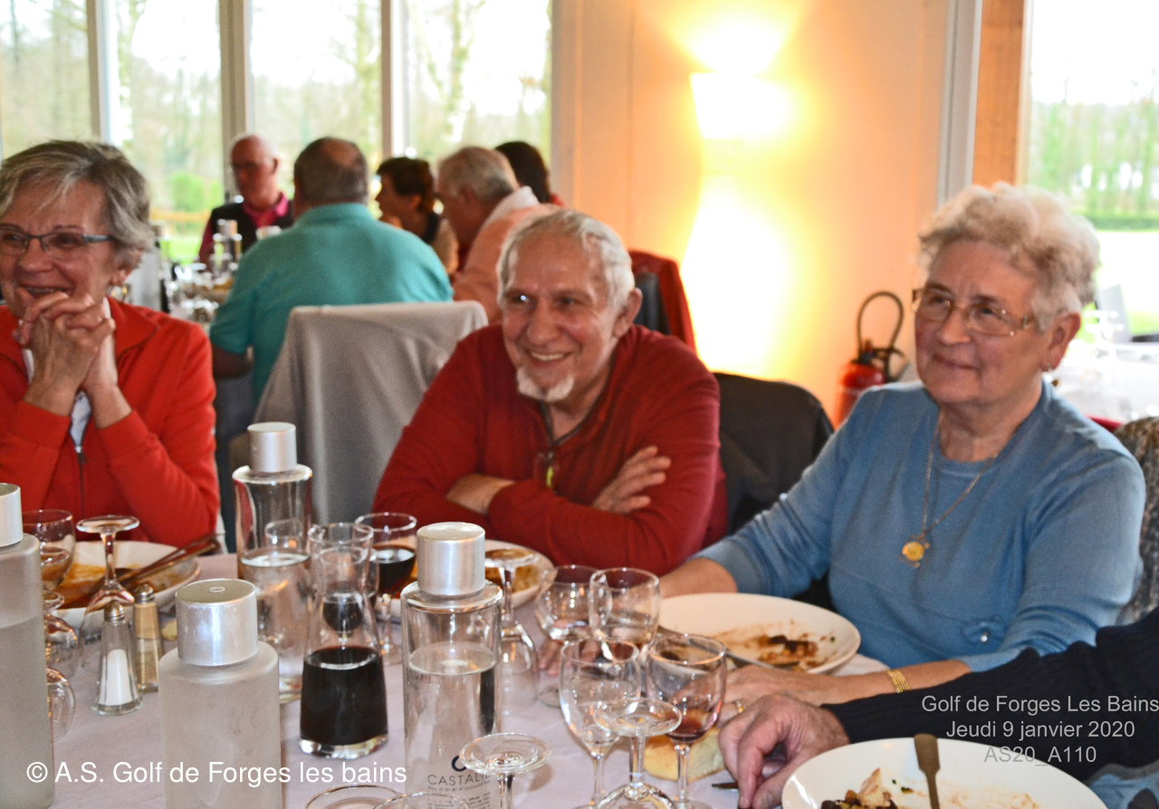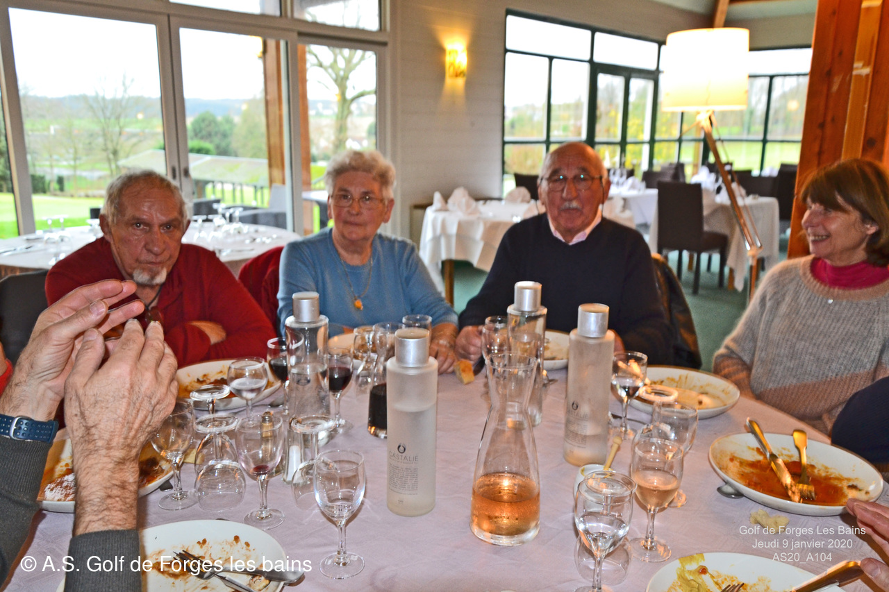 Pour le repas, les Semainiers ont eu le plaisir de revoir ARMAND et MONIQUE Moisy qui ont fait le déplacement spécialement pour l'occasion et l'Association Sportive a accueilli l'équipe de notre GREEN KEEPER pour partager la galette des rois dans laquelle se trouvait une Fève en marque balle logotée Forges les bains