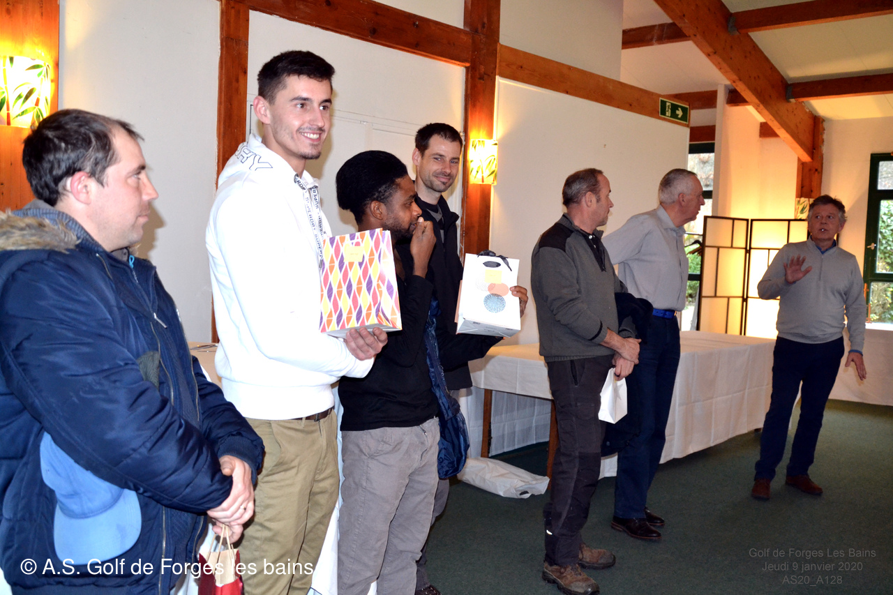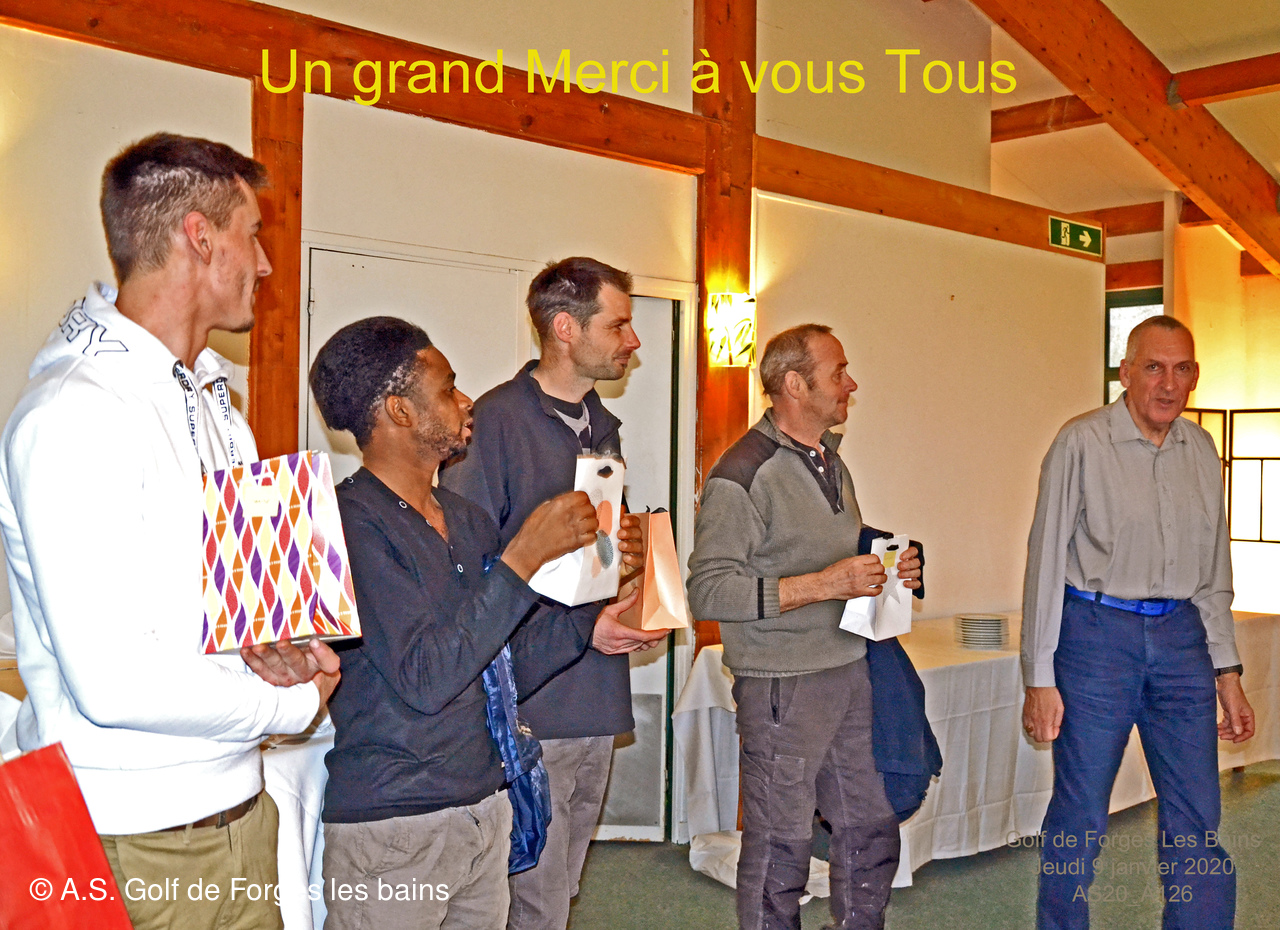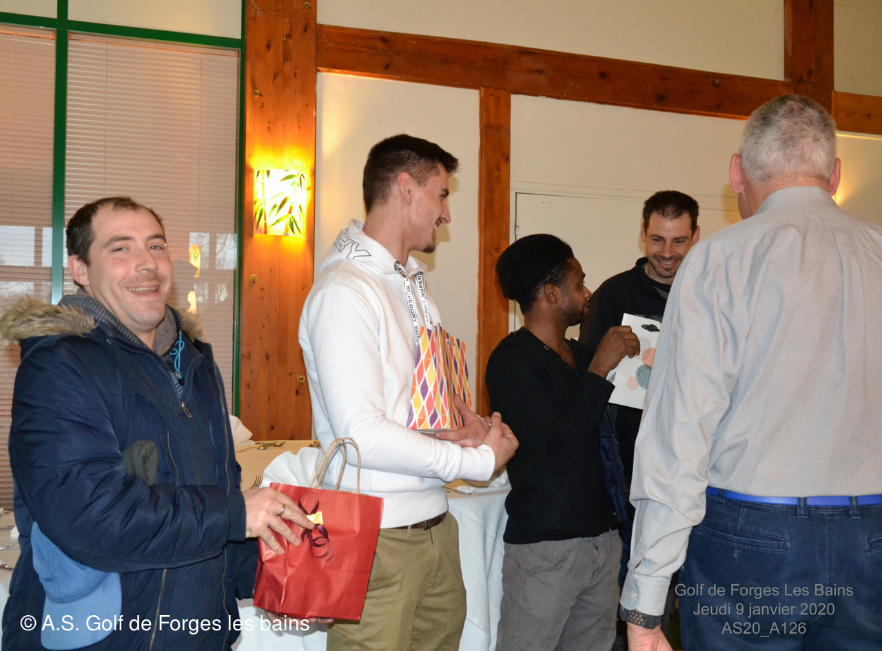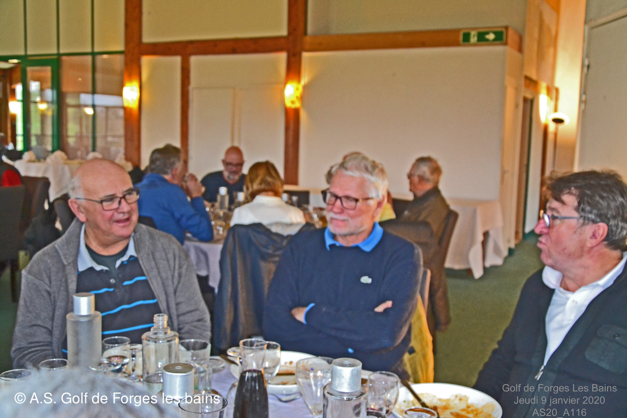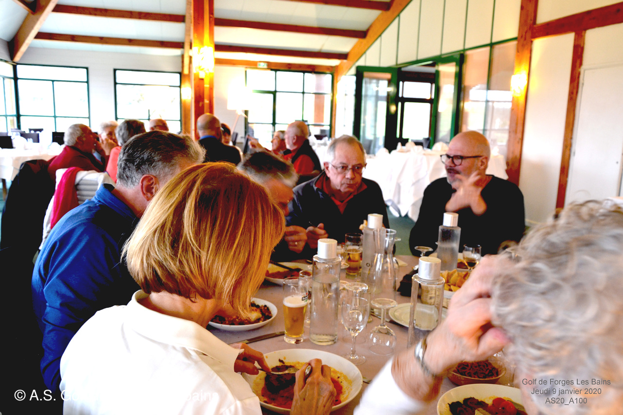 Pour le repas, les Semainiers ont eu le plaisir de revoir ARMAND et MONIQUE Moisy qui ont fait le déplacement spécialement pour l'occasion et l'Association Sportive a accueilli l'équipe de notre GREEN KEEPER pour partager la galette des rois dans laquelle se trouvait une Fève en marque balle logotée Forges les bains