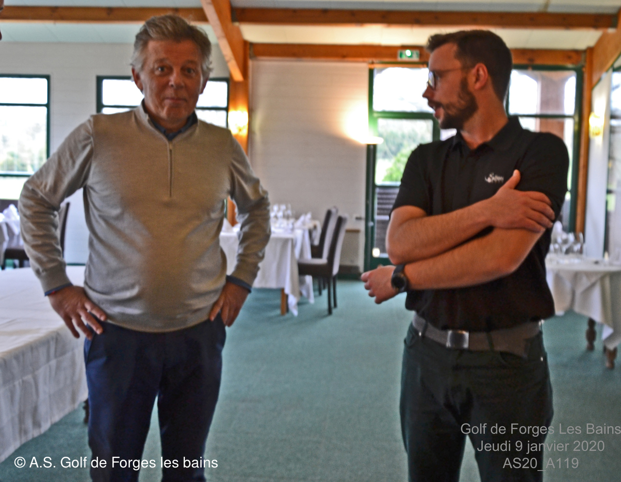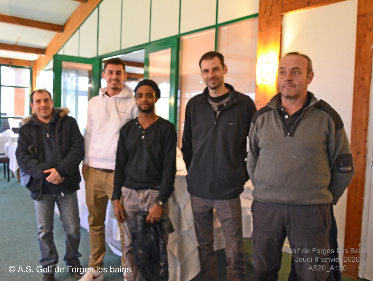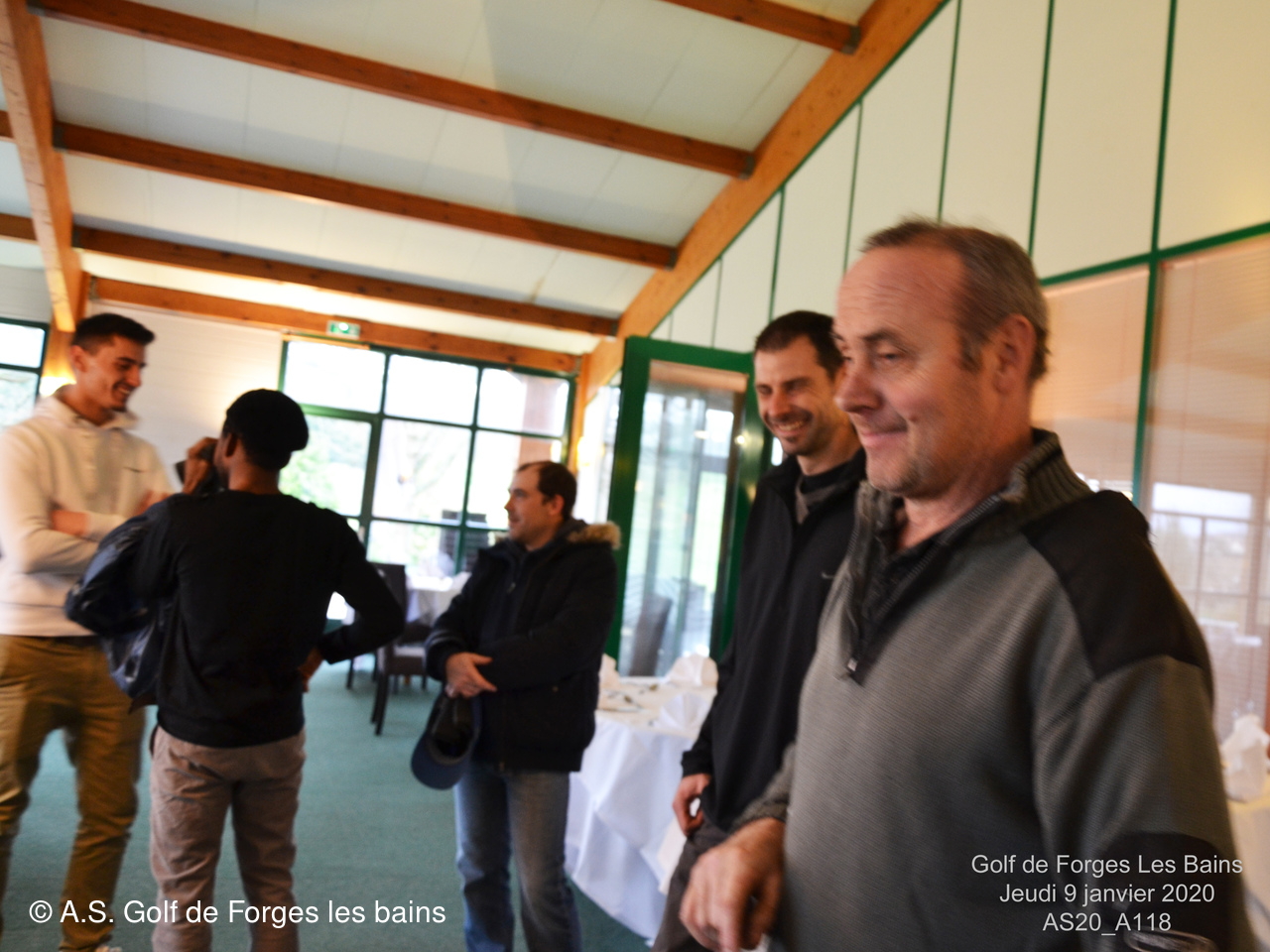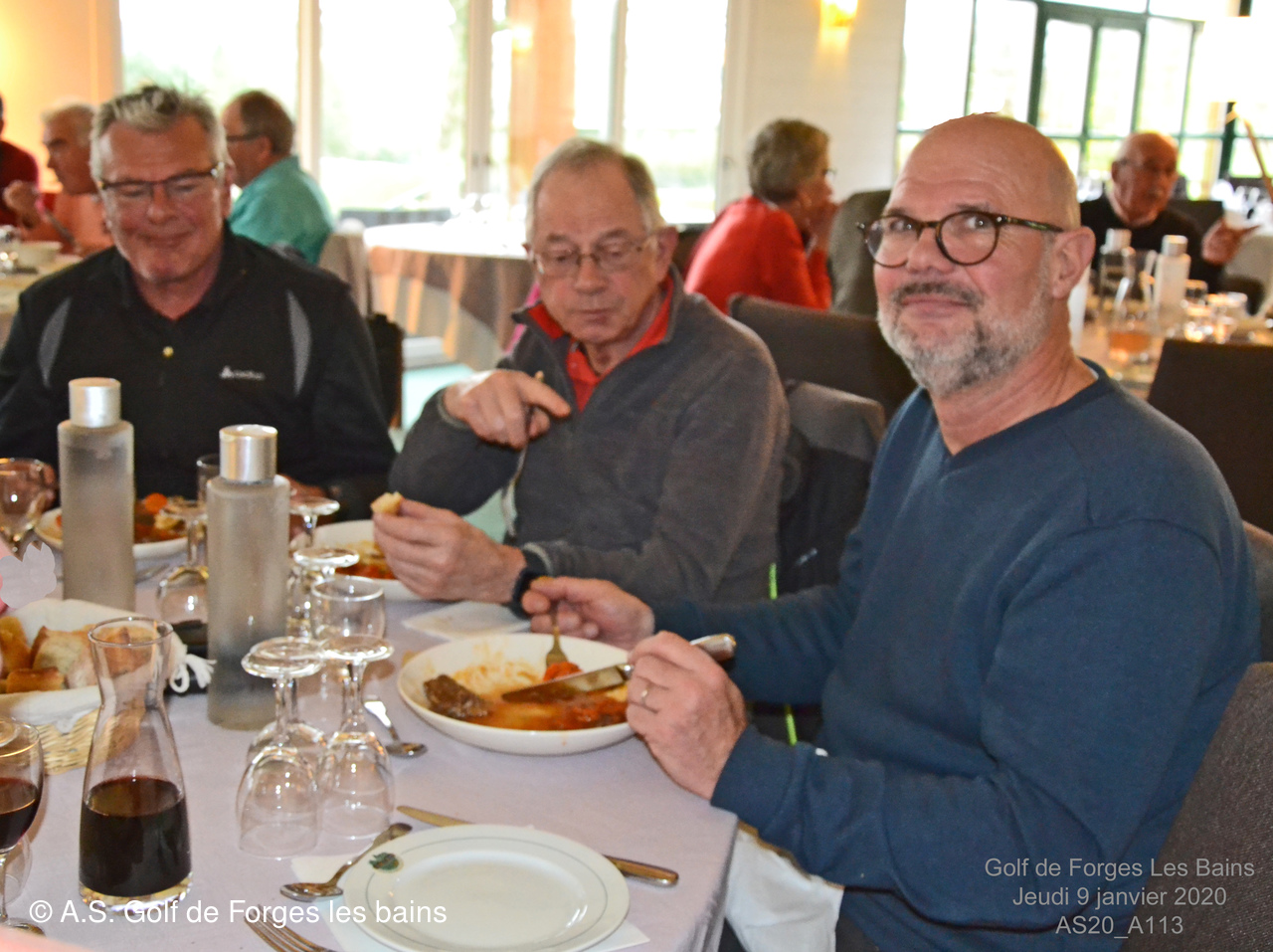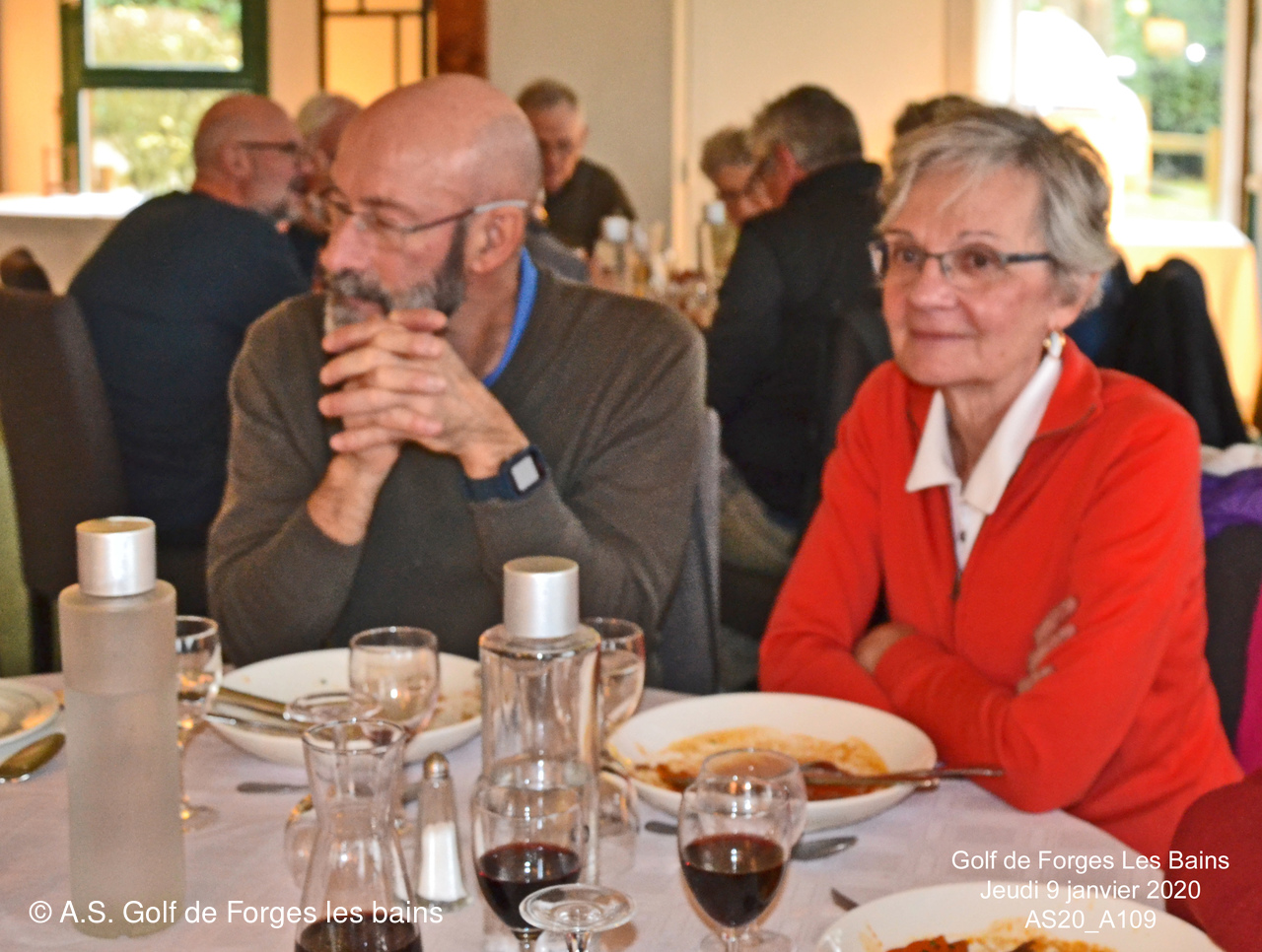 Pour le repas, les Semainiers ont eu le plaisir de revoir ARMAND et MONIQUE Moisy qui ont fait le déplacement spécialement pour l'occasion et l'Association Sportive a accueilli l'équipe de notre GREEN KEEPER pour partager la galette des rois dans laquelle se trouvait une Fève en marque balle logotée Forges les bains